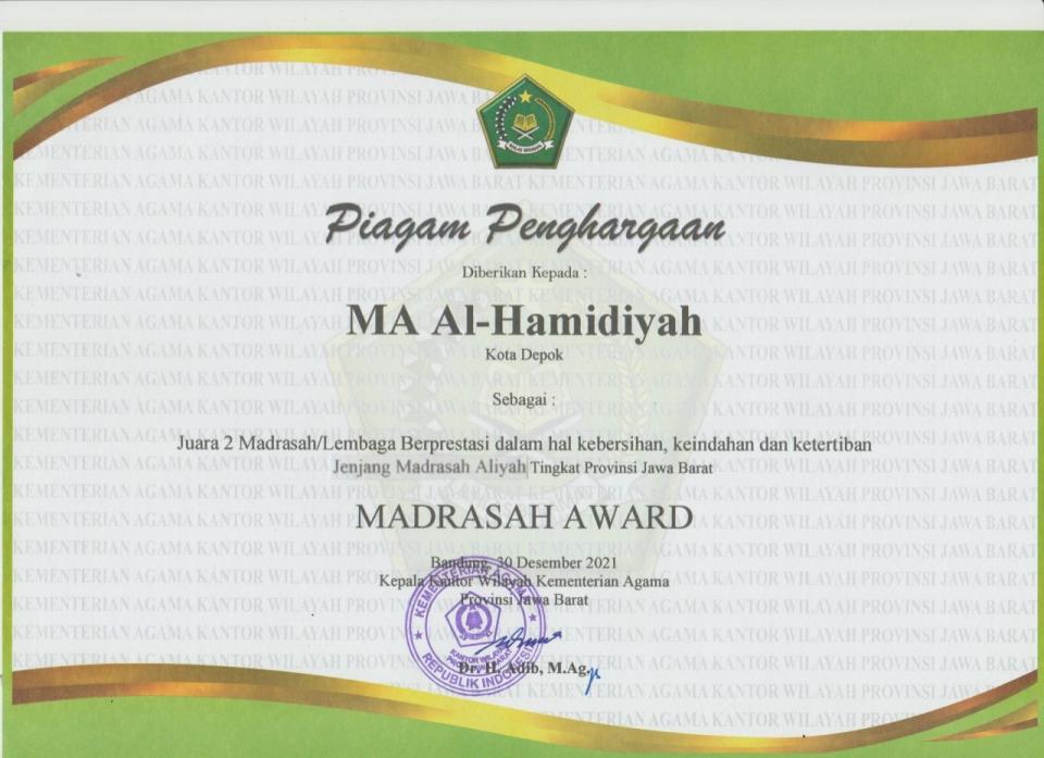 Alhamdulilah, MA Al-Hamidiyah telah terpilih mendapatkan penghargaan Madrasah Award Tingkat Provinsi Jawa Barat, pada kategori Madrasah/Lembaga Berprestasi dalam hal kebersihan, keindahan dan ketertiban. Penyerahan Penghargaan Madrasah Award diberikan pada Upacara Peringatan HAB (Hari Amal Bhakti) Kementerian Agama Republik Indonesia Tingkat Kota Depok Ke-76 pada hari Senin, 03 Januari 2022 di MTS Negeri Kota Depok, Kampung Sawah, Jatimulya, Depok oleh Kepala Kantor KEMENAG Kota Depok - Bapak Hj. Asnawi, S. Ag.