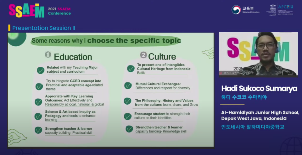 Kami ucapkan selamat pada Bapak Hadi Sukoco, Kepala Divisi Pendidikan Dasar dan Menengah Yayasan Islam Al-Hamidiyah Depok atas perannya mewakili Indonesia sebagai presenter dalam Sharing Stories of Asia Pacific Education Movements (SSAEM) pada 28 Oktober 2021 yang berlangsung secara daring sebagai guru praktik terbaik yang terpilih untuk mempresentasikan kegiatan pendidikan di sekolah selama paruh kedua tahun 2021.