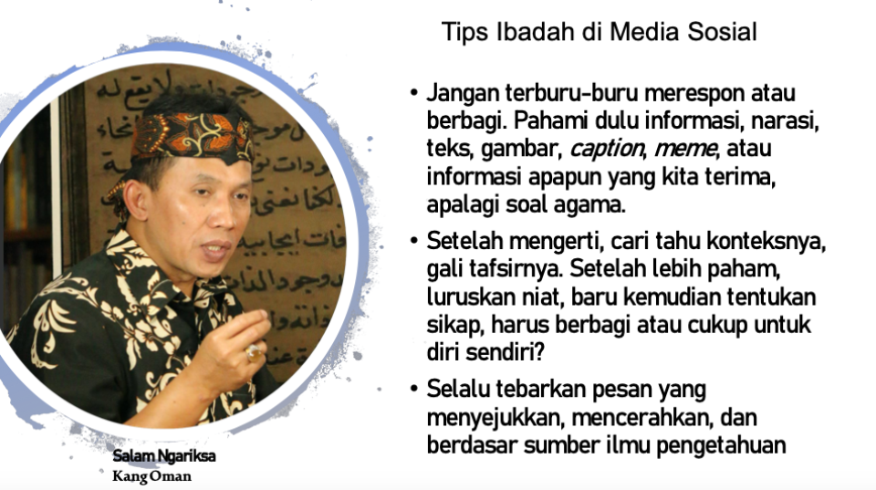 "Kalau dulu yang mau diajak dakwahnya itu mereka yang di majlis taklim di kampung-kampung tapi sekarang madzhab Al-Googliyah dikit-dikit bertanya ke Google. Maka dakwah kita majlisnya itu kini Al-Facebookiyah, berdakwah di Al-WhatsAppiyah. Kalau mau berceramah muhadharahnya itu melalui Thread di Twitter, maka jadi majlis Al-Twitteriyah," ungkap Kiai Oman.