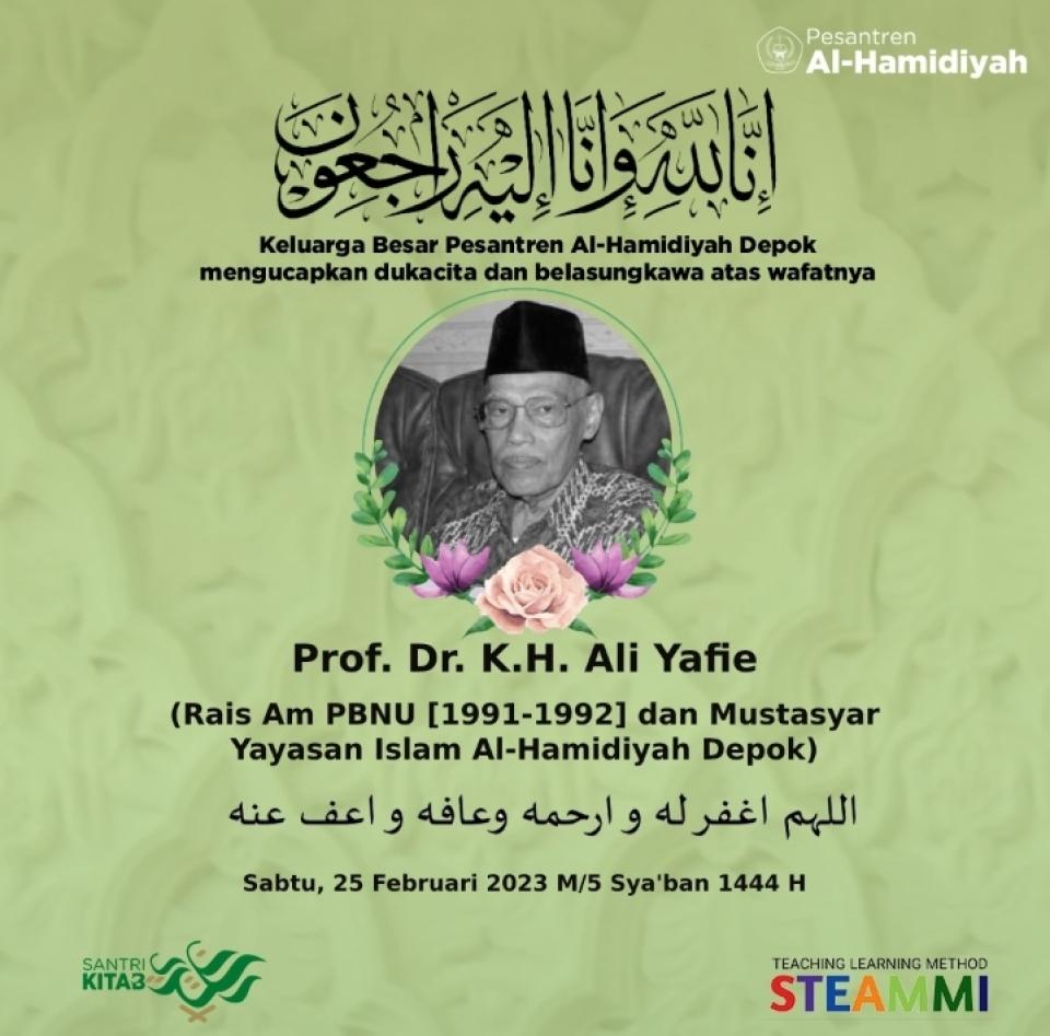 “Tentu keluarga besar Pesantren Al-Hamidiyah merasa sangat kehilangan atas wafatnya Prof. Dr. K.H. Ali Yafie. Beliau adalah mustasyar atau penasihat kita sejak pesantren ini didirikan. Oleh karenanya, mudah-mudahan doa dan tahlil yang tadi kita bacakan diijabah oleh Allah Swt, dan disampaikan pahalanya untuk almarhum,” imbuhnya.