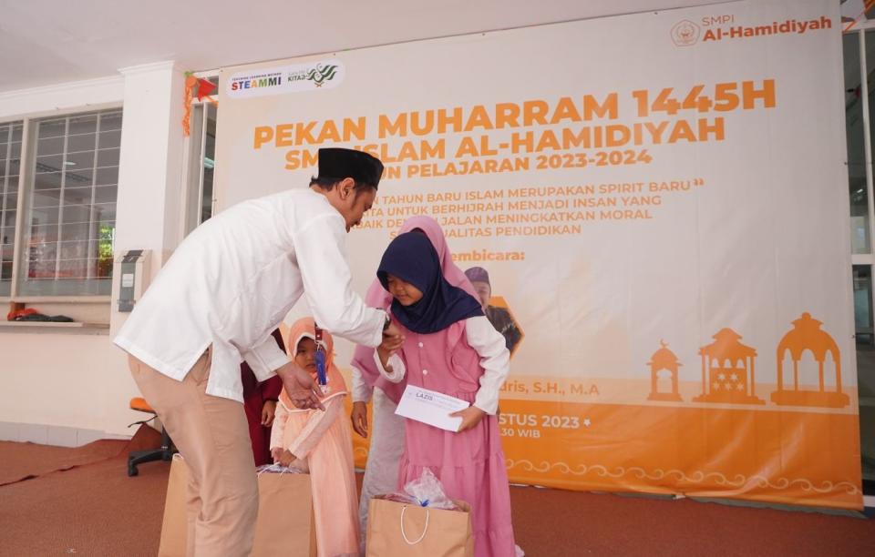 SMPI Al-Hamidiyah menyelenggarakan acara Gebyar Muharram 1445 H, pada tanggal 25 Agustus 2023. Tujuan dari dilaksanakan acara ini yaitu; (1) Mengingatkan akan perjuangan Rasulullah Muhammad SAW dalam berdakwah menyebarkan ajaran islam, (2) Mengambil pelajaran dan contoh tentang sikap serta prinsip Rasulullah dalam berdakwah menyebarkan ajaran agama Islam, (3) Memberikan semangat serta motivasi kepada seluruh siswa akan pentingnya meneladani sikat dakwah Rasulullah SAW, (4) Memberikan gambaran profil sejarah dakwah Rasulullah yang bersumber dari berbagai literasi kitab khususnya kitab Khulasoh Nurul Yaqin, dan (5) Mengingatkan bahwa bulan Muharram adalah awal tahun baru Hijriyah yang merupakan sebuah event penting bagi umat islam untuk saling berbagi melalau santunan anak yatim.