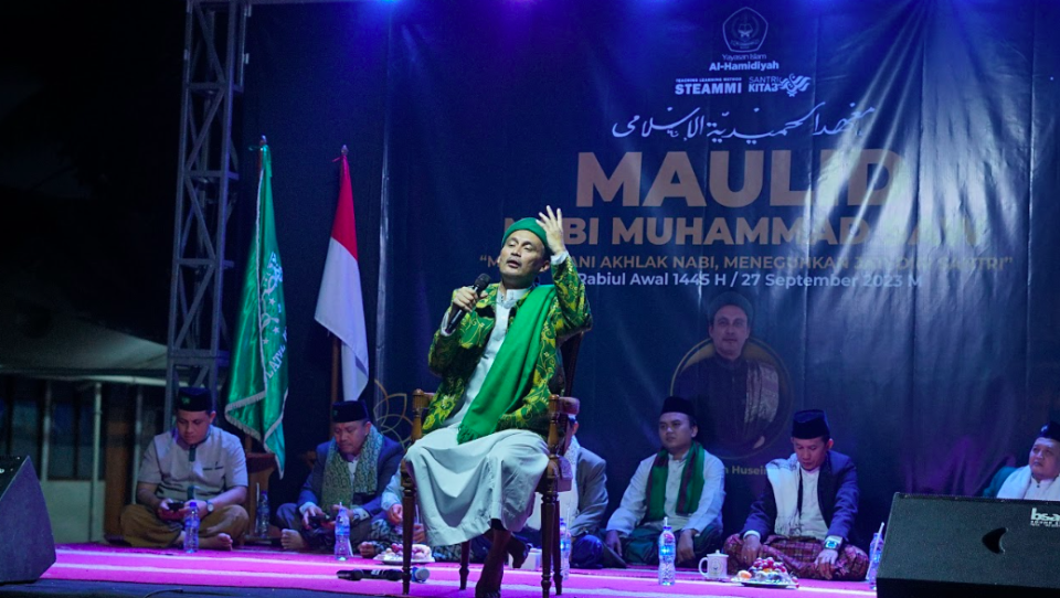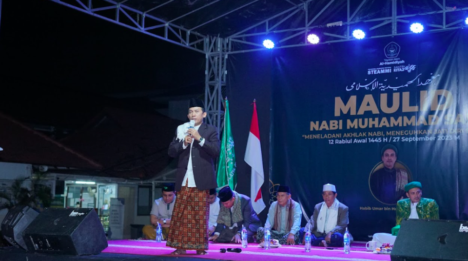 Kegiatan Maulid Nabi 1445 H di Pesantren Al-Hamidiyah diakhiri dengan doa yang dipimpin oleh K.H. Jauhari Sadji, Lc. Acara ini diselenggarakan secara fisik dan daring melalui saluran YouTube Pesantren Al-Hamidiyah.