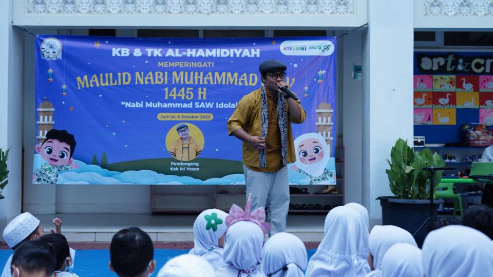 Dalam rangka memperingati hari lahir Nabi Muhammad SAW, KB & TK Al-Hamidiyah mengadakan kegiatan Maulid Nabi yang dilaksanakan pada Jumat, 6 Oktober 2023 / 20 Robiul Awal 1445 H. Menghadirkan bintang tamu utama yaitu Kak Iki Yosan sebagai pendongeng. Beliau menyampaikan kisah-kisah inspiratif Nabi Muhammad SAW secara menyenangkan yang mengundang gelak tawa para siswa. Penyampaian cerita tentang Nabi Muhammad SAW bertujuan memunculkan rasa kagum pada anak dan menjadikan Nabi Muhammad SAW idola mereka.