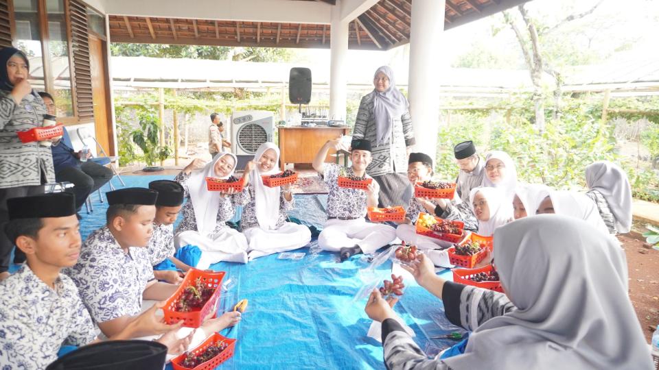 Seluruh santri, baik putra maupun putri dari Madrasah Tsanawiyah (MTs) dan Madrasah Aliyah (MA), tampak antusias mengikuti acara kunjungan ini. Tidak hanya menikmati petik buah anggur, tetapi juga memperluas pengetahuan mereka tentang jenis-jenis anggur dan teknik menanam yang berkelanjutan.