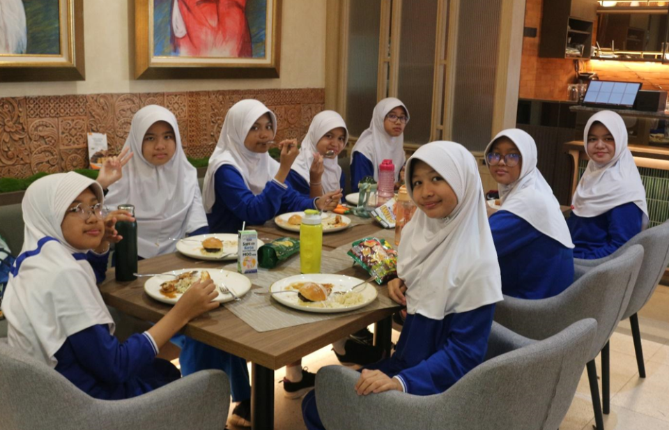 Hello, my name is Raihana Nurfayza Iswari (Raihana) and this is Prita Nadira Bayutomo (Prita). We are from 6 Khalid Bin Walid. On February 25th, 2025, 6 Ali Bin Abi Thalib and 6 Khalid Bin Walid went to Mulligans Bistro in Bogor by Big Bird bus. Before starting the activities at Mulligans Bistro, all the students and teachers took a picture together.