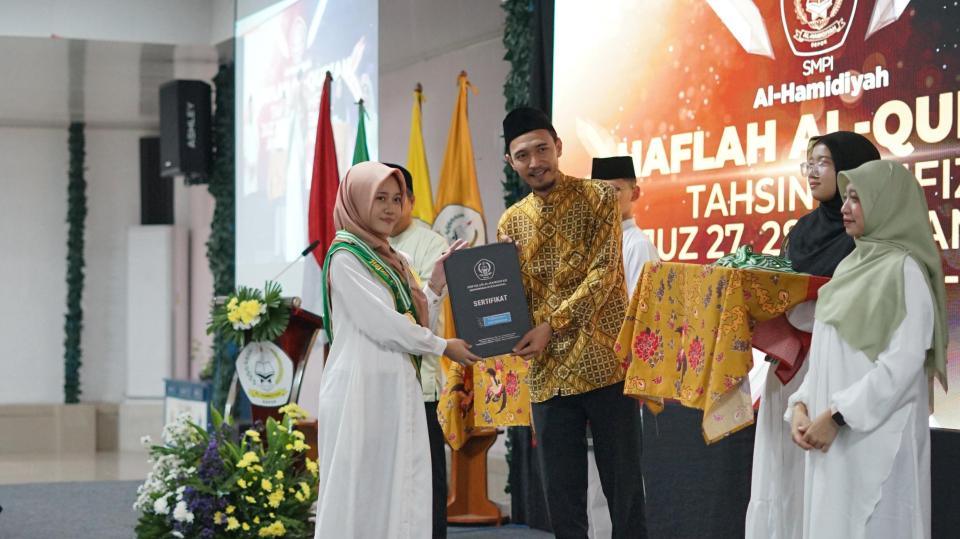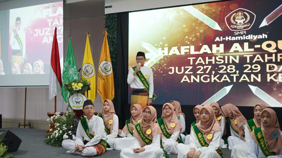 Depok Kamis, 29 Mei 2025. SMP Islam Al-Hamidiyah telah menyelenggarakan Haflah Al-Qur'an Angkatan VI di Gedung Serua Green Village Sawangan. Haflah Al-Qur'an merupakan puncak dari rangkaian kegiatan pembelajaran Al-Qur'an di SMP Islam Al-Hamidiyah. Kegiatan ini diisi dengan khataman Al-Qur'an 30 Juz, Do'a Khatmul Qur'an, Uji Kompetensi Al-Qur'an, dan pemberian penghargaan bagi peserta didik yang telah menuntaskan pembelajaran Al-Qur'an di SMP Islam Al-Hamidiyah.