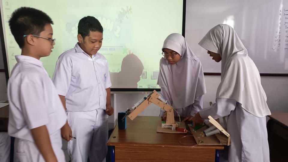 Level 6, membuat “Aktor Dibalik Gerak Tangan” Siswa menjelajahi bidang Biomekanika dan Hidrolik. Mereka membuat replika tangan yang dapat bergerak (seperti tangan robot) dengan memanfaatkan prinsip tekanan air (pompa hidrolik), menunjukkan kompleksitas Rekayasa tubuh manusia.
