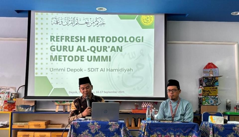SDIT Al-Hamidiyah Kembali menggelar kegiatan Penyegaran materi metodologi guru Al-Qur’an bekerja sama dengan Ummi Foundation Kota Depok pada Selasa dan Rabu, 16-17 September 2025, bertepatan dengan kegiatan Sumatif Tengah Semester (STS) Ganjil. Kegiatan tahunan ini bertujuan untuk memperkuat kembali kompetensi guru Al-Qur’an dalam mengajar dengan metode Ummi. Selain itu, kegiatan ini juga dimaksudkan untuk menyamakan persepsi, menyegarkan kembali semangat, serta memastikan kualitas pembelajaran Al-Quran di SDIT Al-Hamidiyah berjalan sesuai standar Ummi Foundation. Kegiatan berlangsung mulai pukul 08.00 WIB hingga 15.00 WIB dengan menghadirkan trainer Ustaz Syam Hariyadi, M.Pd. dan Ustaz Ismail Saleh, M.Pd., selaku perwakilan dari Ummi Foundation Kota Depok. Peserta terdiri atas Koordinator Qur’an dan seluruh guru pengajar Al-Qur’an di SDIT Al-Hamidiyah.