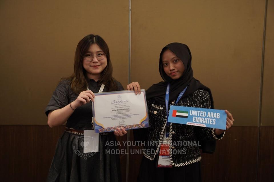 Di antara para delegasi tersebut, dua siswi SMP Al-Hamidiyah berhasil meraih penghargaan bergengsi pada Komite UNICEF. Adivi Diandra Balqis (Kelas VIII) mendapat penghargaan Best Position Paper sebagai delegasi United Arab Emirates di UNICEF Chamber 1, sementara Yuriochika Aurora Janeeta (Kelas VIII) meraih penghargaan yang sama sebagai delegasi Yemen di UNICEF Chamber 2.