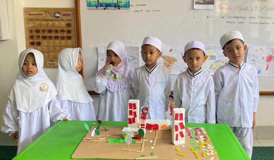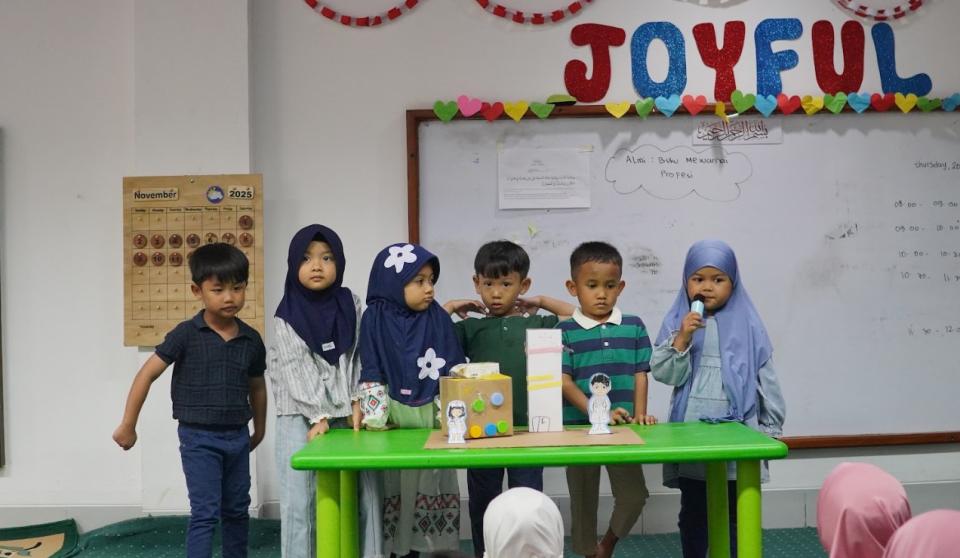 Kindergarten A carried out a Community Helpers Project consisting of four categories: Hospital, Train Station, Airport, and Fire Station. All projects were created using eco-friendly materials, allowing the children not only to learn concepts of science, technology, engineering, arts, and mathematics, but also to understand the importance of caring for the environment. The activities were further strengthened with Islamic values through the recitation of Qur’anic verses and hadith as motivation and a form of positive spiritual habituation. The children went through a series of stages—from observing, designing, to presenting their work—as practice in critical thinking, creativity, and self-confidence.