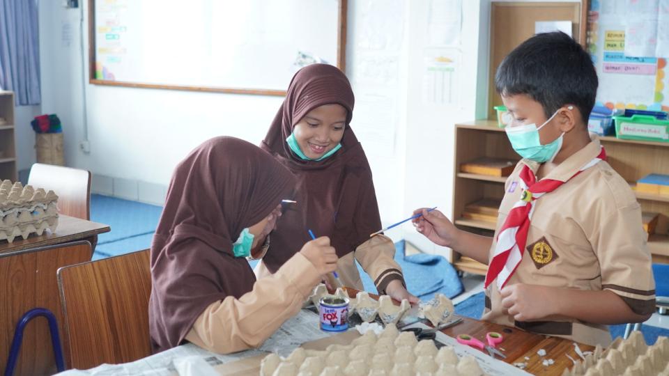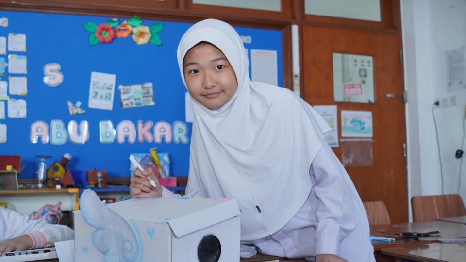 Memanfaatkan limbah kardus sepatu, siswa Level 5 menciptakan proyektor mini sebagai solusi untuk mengurangi dampak negatif penggunaan gadget berlebih, seperti risiko mata minus (miopia), mata lelah (digital eye strain), dan paparan sinar biru (blue light).